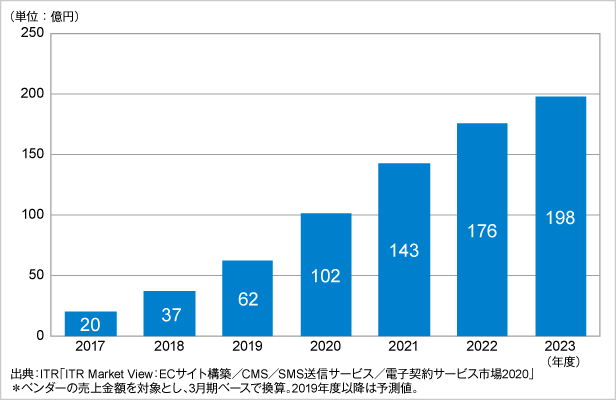 コンサルティングを行うアイ・ティ・アールが発表した「ITR Market View:ECサイト構築/CMS/SMS送信サービス/電子契約サービス市場2020」には、今後さらに電子契約の需要は高まってくる傾向を見ることができます。