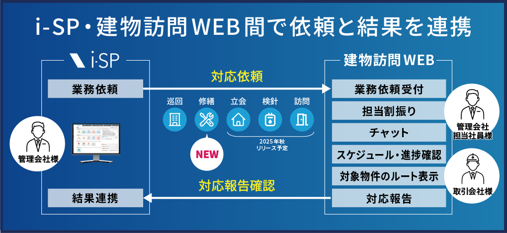 「建物訪問WEB」は、ビジュアルリサーチが提供する賃貸管理システム「i-SP」のオプションサービスとなり、「i-SP」と「建物訪問WEB」間で業務依頼及び対応結果報告が連携されます。