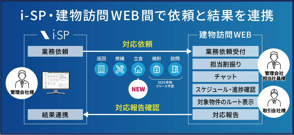 「建物訪問WEB」は、ビジュアルリサーチが提供する賃貸管理システム「i-SP」のオプションサービスとなり、「i-SP」と「建物訪問WEB」間で業務依頼及び対応結果報告が連携されます。
